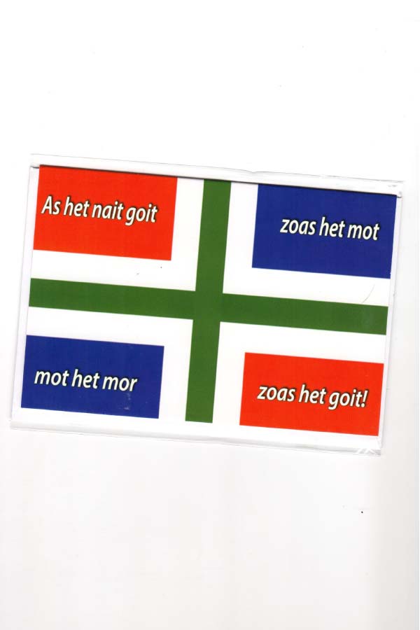 wenskaart groningen – kaart met Gronings dialect en de tekst “As het nait goit zoas het mot, mot het mor zoas het goit!”. Bekende Groningse spreuk met vlag. Gedrukt op stevig papier en geleverd met enveloppen. Verpakt per 6 stuks.