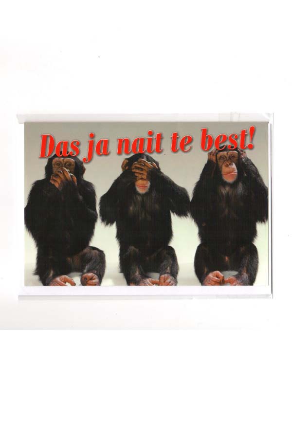 wenskaart groningen – kaart met Gronings dialect en de tekst “Das ja nait te best!”. Achterkant met drie apen – Groningse knipoog. Gedrukt op stevig papier en geleverd met enveloppen. Verpakt per 6 stuks.