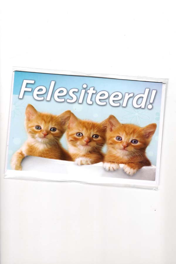 wenskaart groningen – kaart met Gronings dialect en de tekst “Felesiteerd!”. Schattige kittens – altijd goed voor een glimlach. Gedrukt op stevig papier en geleverd met enveloppen. Verpakt per 6 stuks.