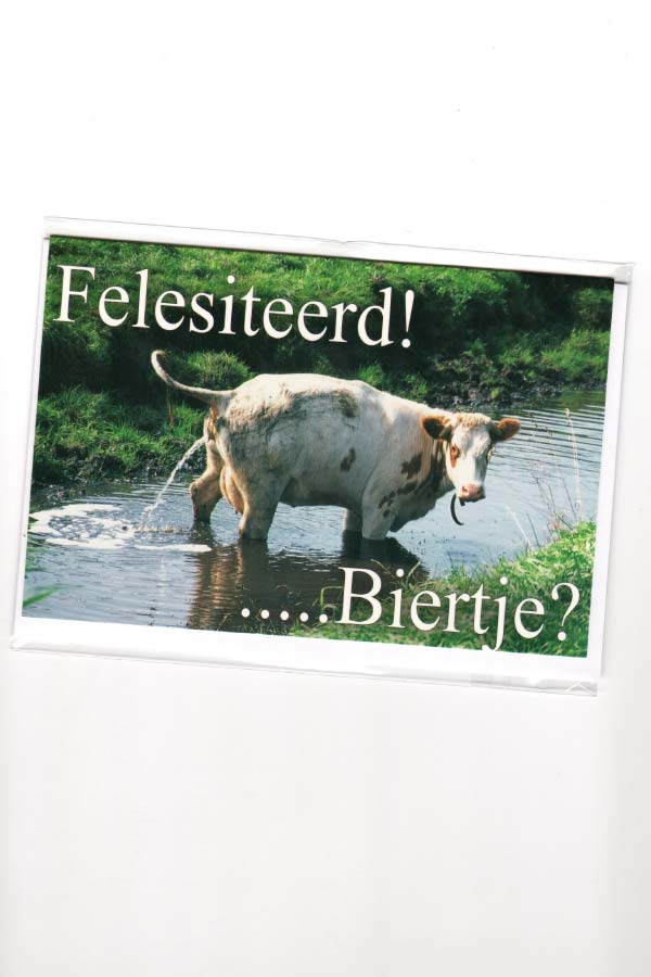 wenskaart groningen – kaart met Gronings dialect en de tekst “Felesiteerd! … Biertje?”. Grappige verjaardagskaart met koe en biertje-knipoog. Gedrukt op stevig papier en geleverd met enveloppen. Verpakt per 6 stuks.