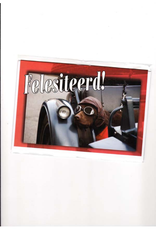 wenskaart groningen – kaart met Gronings dialect en de tekst “Felesiteerd!”. Vrolijke verjaardagskaart met hond in zijspan. Gedrukt op stevig papier en geleverd met enveloppen. Verpakt per 6 stuks.