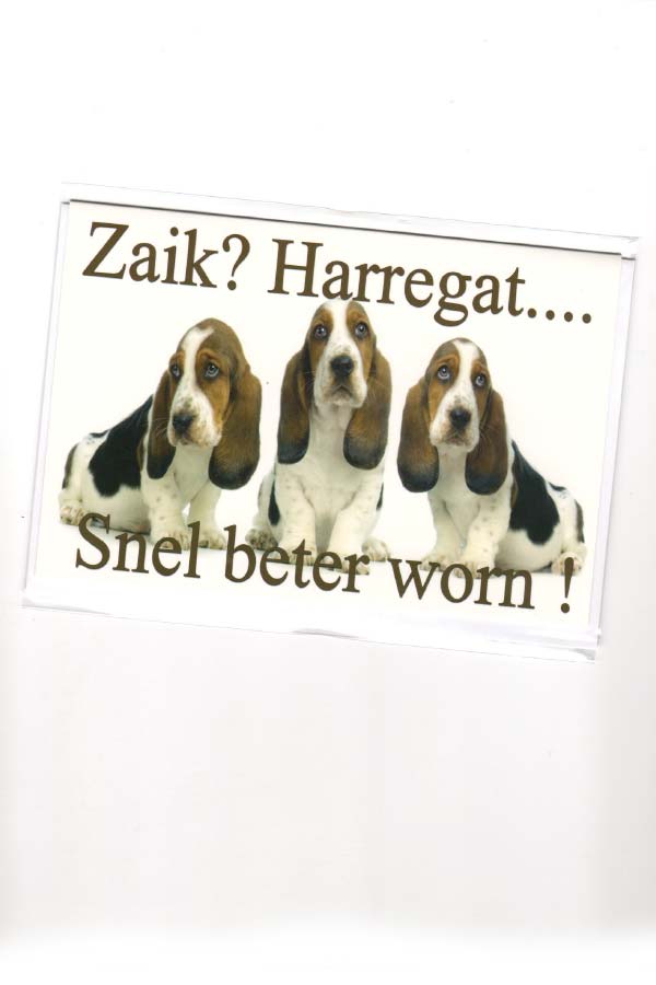 wenskaart groningen – kaart met Gronings dialect en de tekst “Zaik? Harregat…. Snel beter worn!”. Luchtige beterschapskaart met basset-hondjes. Gedrukt op stevig papier en geleverd met enveloppen. Verpakt per 6 stuks.
